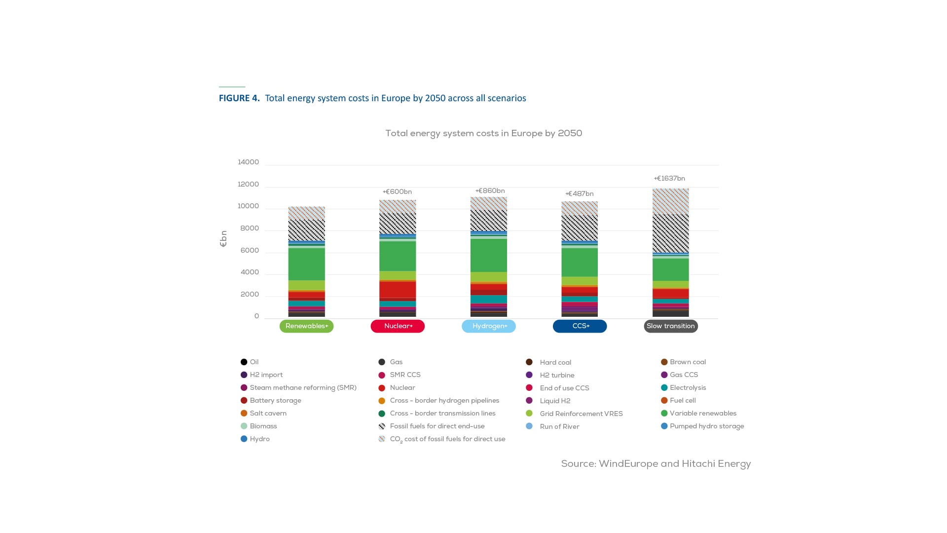 Περιλαμβάνονται επίσης τα κόστη αποθήκευσης ενέργειας - είτε μέσω μπαταριών είτε μέσω υδρογόνου - καθώς και οι επενδύσεις για την ενίσχυση της διασυνδεσιμότητας των ευρωπαϊκών δικτύων.
