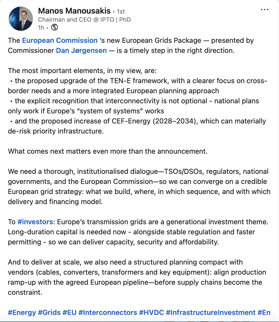 «Η νέα δέσμη μέτρων της Ευρωπαϊκής Επιτροπής για τα ευρωπαϊκά δίκτυα ηλεκτρικής ενέργειας — η οποία παρουσιάστηκε από τον Επίτροπο Dan Jørgensen — αποτελεί ένα έγκαιρο βήμα προς τη σωστή κατεύθυνση», αναφέρει ο ισχυρός άνδρας του ΑΔΜΗΕ, στέλνοντας πολλαπλά μηνύματα τόσο προς τους θεσμικούς φορείς της πανευρωπαϊκής αγοράς δικτύων, όσο προς τους επενδυτές αλλά και το δίκτυο των προμηθευτών ηλεκτρικής ενέργειας για θεσμοθετημένο και πανευρωπαϊκό συντονισμό.