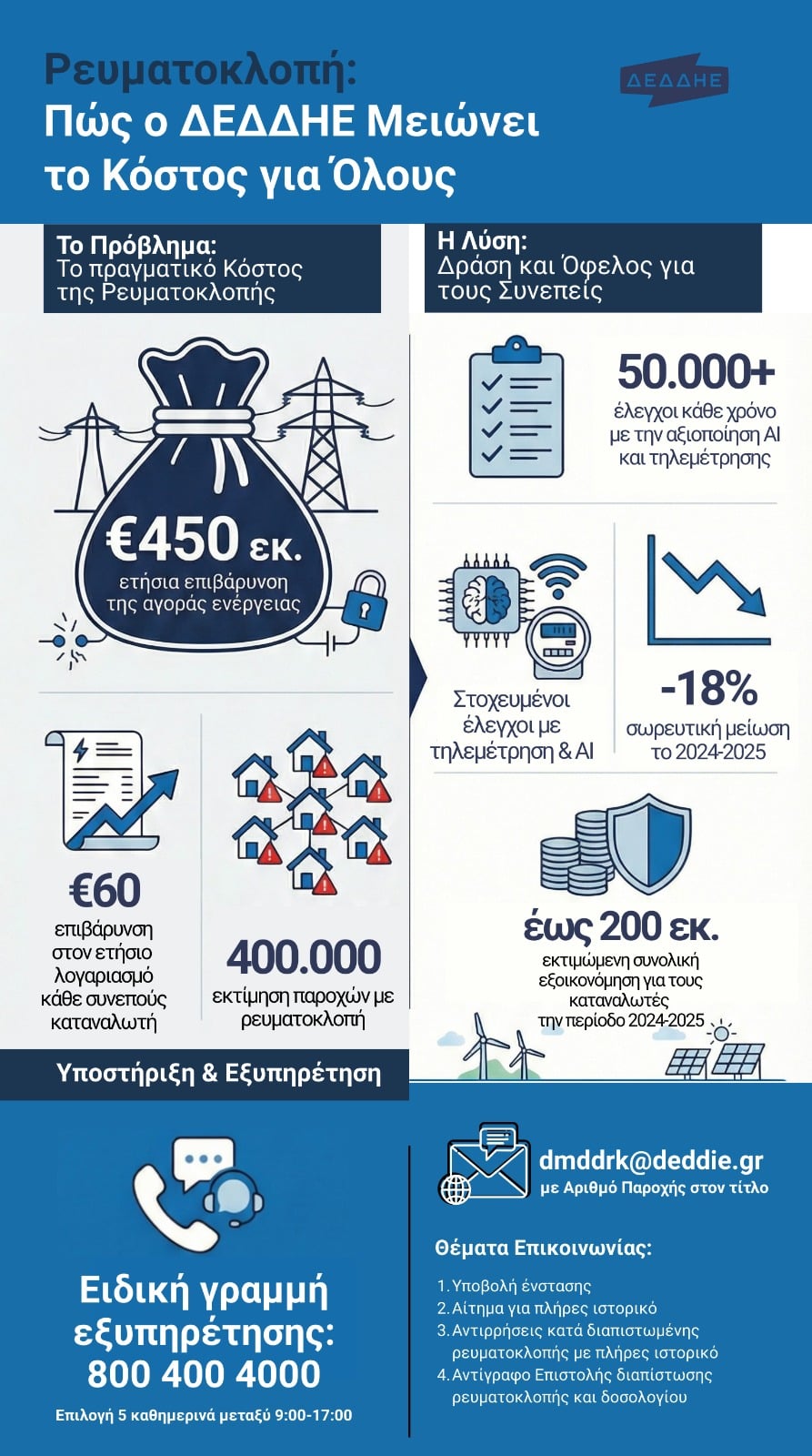 Στο πλαίσιο αυτό, ο ΔΕΔΔΗΕ έχει εντατικοποιήσει σημαντικά τους ελέγχους το τελευταίο διάστημα, πραγματοποιώντας περισσότερες από 50.000 τεχνικές επιθεωρήσεις το 2025 (+48% σε σχέση με το 2024). Επιπλέον, όπως αναφέρεται, «σύστησε ειδική ομάδα έμπειρων στελεχών και εξειδικευμένο τμήμα στο τηλεφωνικό κέντρο», με στόχο την επιτάχυνση των ελέγχων και την προστασία των συνεπών καταναλωτών.
