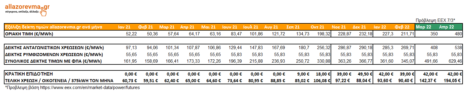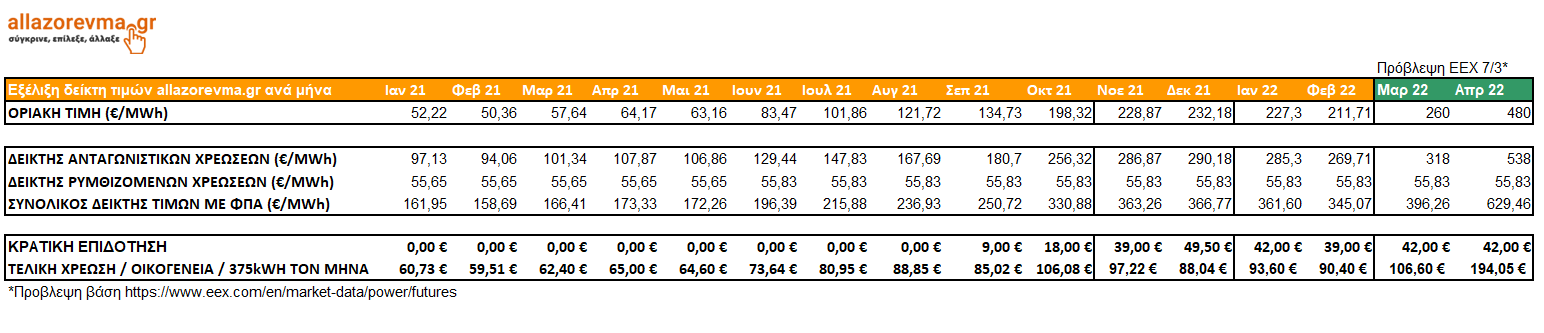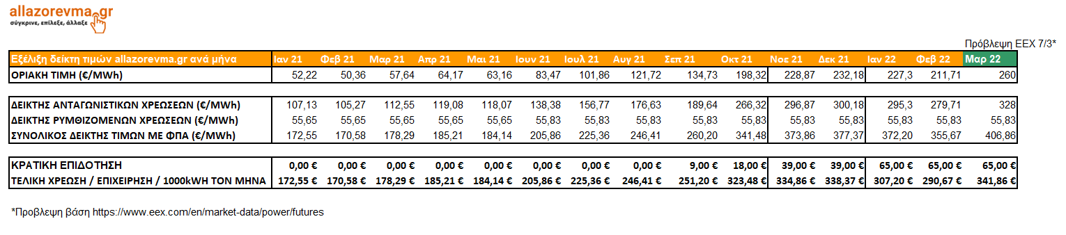 Στο ευρωπαϊκό χρηματιστήριο ενέργειας τα futures για τον Μάρτιο δείχνουν μέση τιμή χονδρικής 260 ευρώ. Με τις μέχρι στιγμής τιμές η μέση τιμή Μαρτίου διαμορφώνεται στα 302,16 ευρώ. Αν δεν αποκλιμακωθούν οι τιμές τις επόμενες ημέρες – πράγμα που δεν διαφαίνεται στον ορίζοντα – η μέση τιμή Μαρτίου θα κλείσει υψηλότερα δείχνοντας ακόμη μεγαλύτερες αυξήσεις.