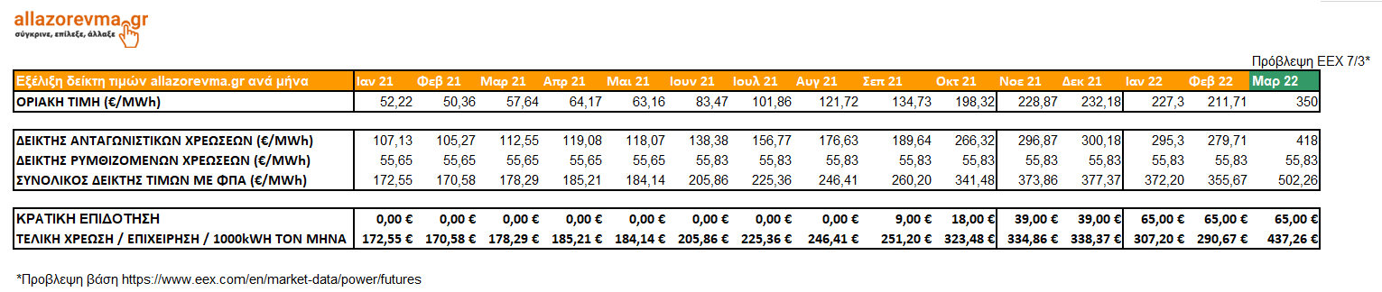 - Με μέση τιμή χονδρικής Μαρτίου στα 350 ευρώ η κατανάλωση για μια μικρή επιχείρηση των 1.000 KWh καταλήγει σε τιμή λιανικής 437,26 ευρώ – Αύξηση 50% συγκριτικά με τα τιμολόγια Φεβρουαρίου