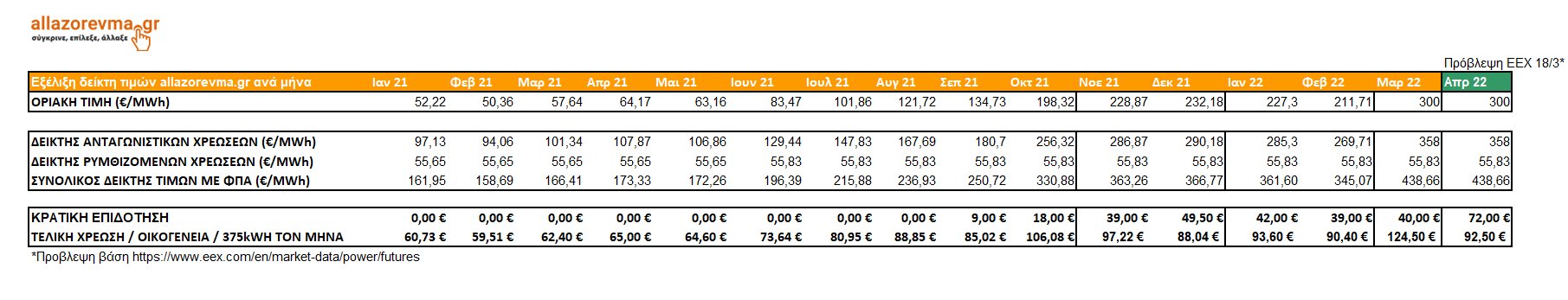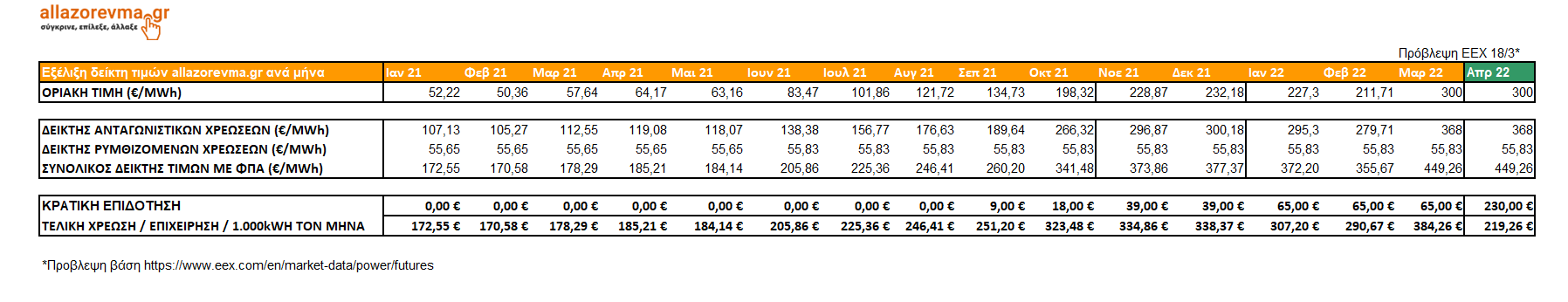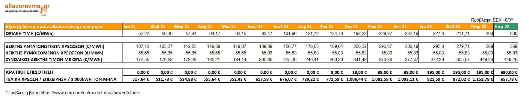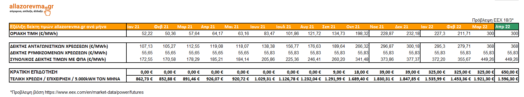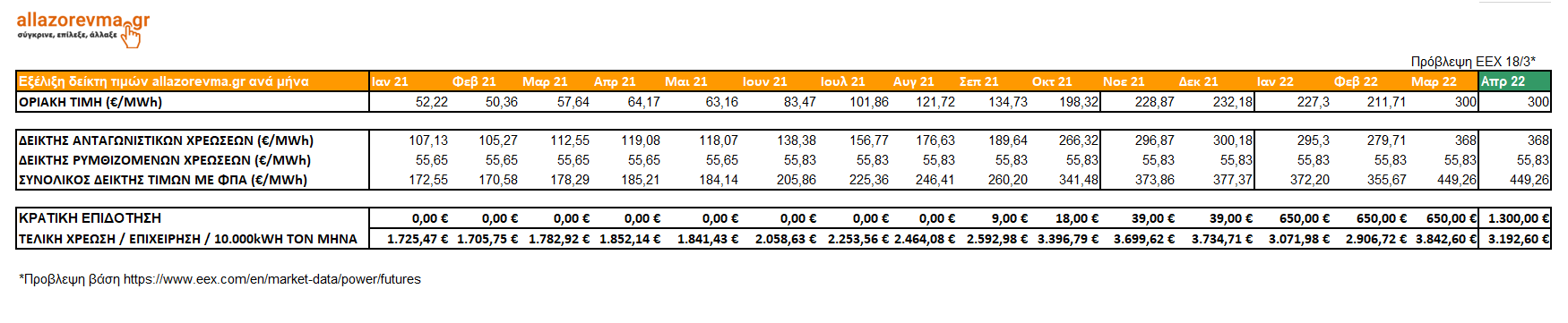 - Επιχείρηση με κατανάλωση 10.000KWh το μήνα (δηλαδή 10MWH) θα πληρώσει τον Απρίλιο 3.192€ από 3.842€ τον Μάρτιο και 2.906€ τον Φεβρουάριο. Παρά την αύξηση της οριακής τιμής κατά 100€ (από τα 211 ευρώ στα 300 ευρώ) η τελική τιμή δεν αυξάνεται σημαντικά - πάντα σε σύγκριση με τον Φεβρουάριο.