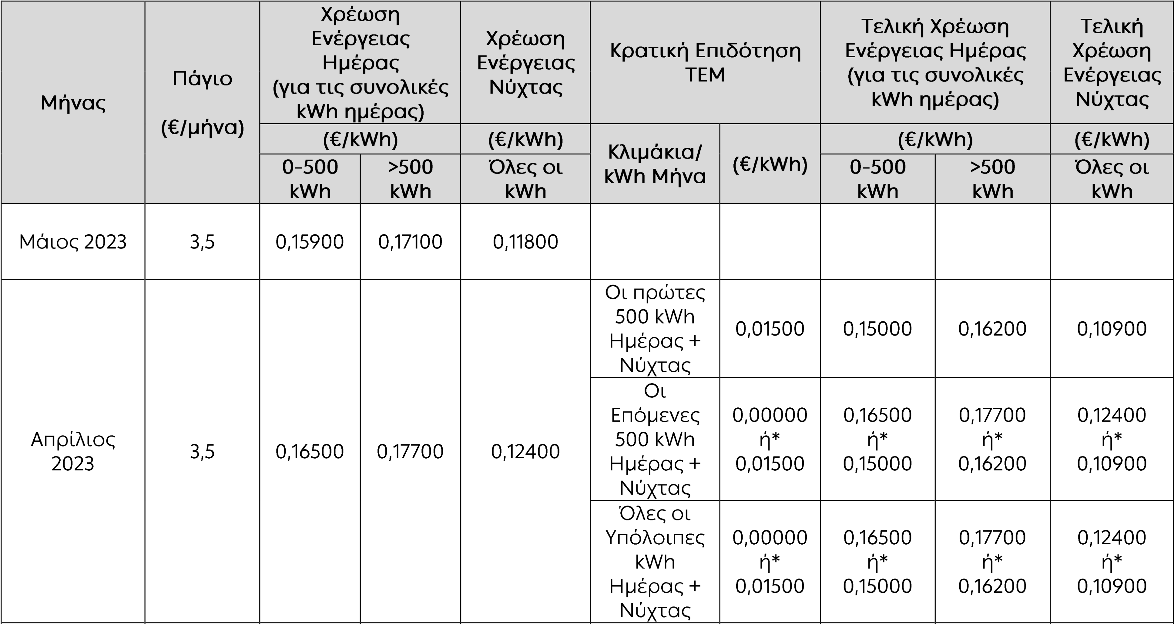 Αναλυτικά η ΔΕΗ ανακοίνωσε σήμερα Πέμπτη 20 Απριλίου, τη χαμηλότερη τιμή από όλους τους προηγούμενους μήνες για τα τιμολόγια ρεύματος του μήνα Μαΐου, παρέχοντας στα νοικοκυριά τις πρώτες 500 κιλοβατώρες με αρχική τιμή 0,15900 ευρώ/KWH από 0,16500 ευρώ/KWH τον Απρίλιο (αρχική τιμή πριν την επιδότηση).