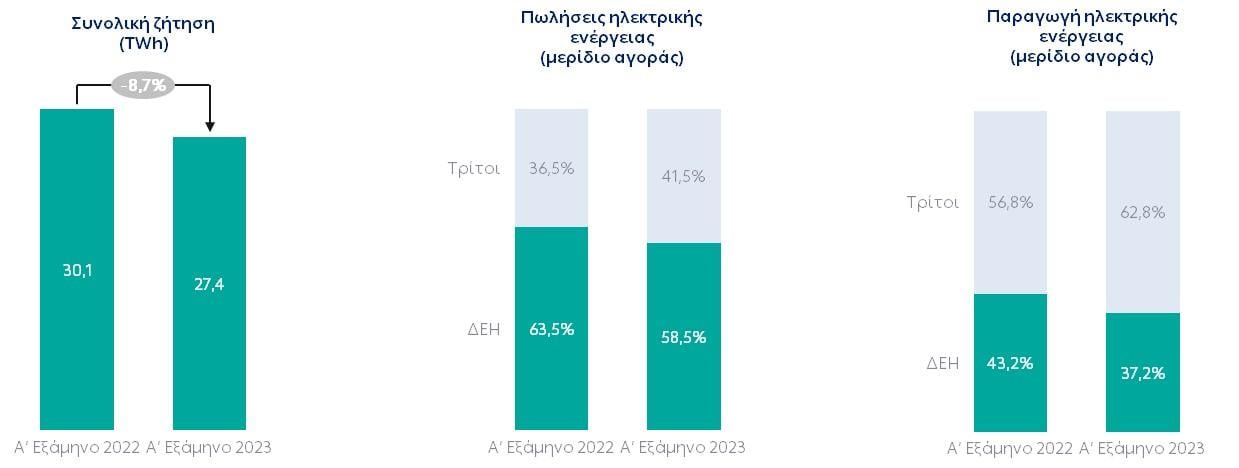 Αναφορικά με την εγχώρια ζήτηση ηλεκτρικής ενέργειας, η πτωτική τάση συνεχίστηκε και το β΄ τρίμηνο του 2023, αν και με χαμηλότερο ρυθμό σε σύγκριση με το α΄ τρίμηνο του 2023, με αποτέλεσμα τη μείωση κατά 8,7% το α΄εξάμηνο του 2023. Ίδιο ποσοστό μείωσης καταγράφηκε και σε επίπεδο συνολικής ζήτησης, περιλαμβάνοντας δηλαδή την ηλεκτρική ενέργεια για εξαγωγές,. Στη μείωση αυτή συνέβαλαν οι ήπιες καιρικές συνθήκες που επικράτησαν το α΄εξάμηνο του 2023, καθώς και τα κίνητρα που παρέχει η Πολιτεία για εξοικονόμηση ενέργειας.