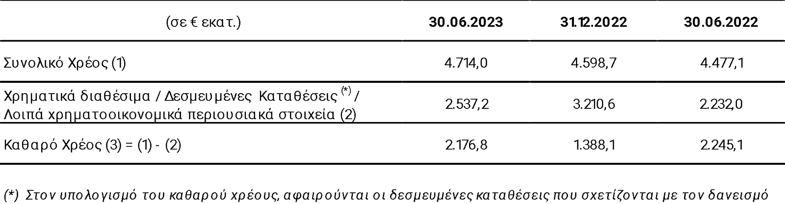 Το καθαρό χρέος στις 30.06.2023 ήταν €2.176,8 εκατ., αυξημένο κατά €788,7 εκατ. σε σχέση με την 31.12.2022 (€1.388,1 εκατ.), λόγω της επίπτωσης από το αρνητικό κεφάλαιο κίνησης το οποίο κατά βάση επηρεάστηκε από την πληρωμή για τα δικαιώματα εκπομπών CO2 για τη συμμόρφωση του έτους 2022, η οποία γίνεται κάθε χρόνο μέχρι το τέλος Μαρτίου του επόμενου έτους.