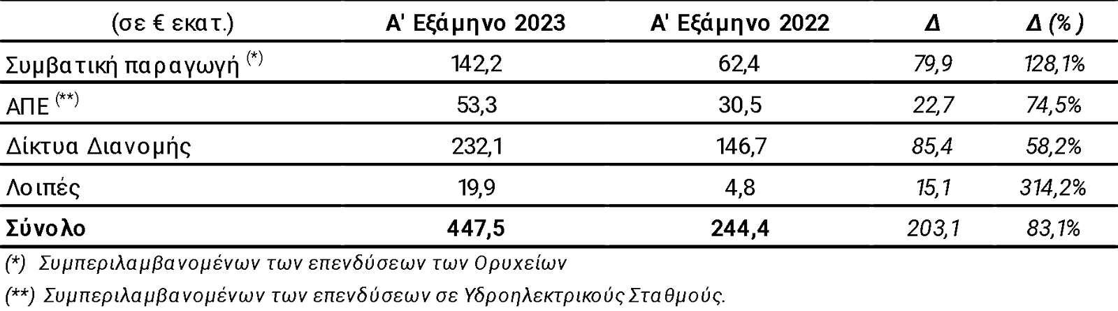 Οι συνολικές επενδύσεις το α’ εξάμηνο 2023 διαμορφώθηκαν σε €447,5 εκατ. έναντι €244,4 εκατ. το α’ εξάμηνο 2022.
