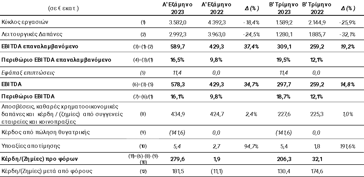 Ειδικότερα για το β΄ τρίμηνο του 2023, το EBITDA σε επαναλαμβανόμενη βάση διαμορφώθηκε σε €309,1 εκατ. έναντι €259,2 εκατ. το αντίστοιχο τρίμηνο του 2022.