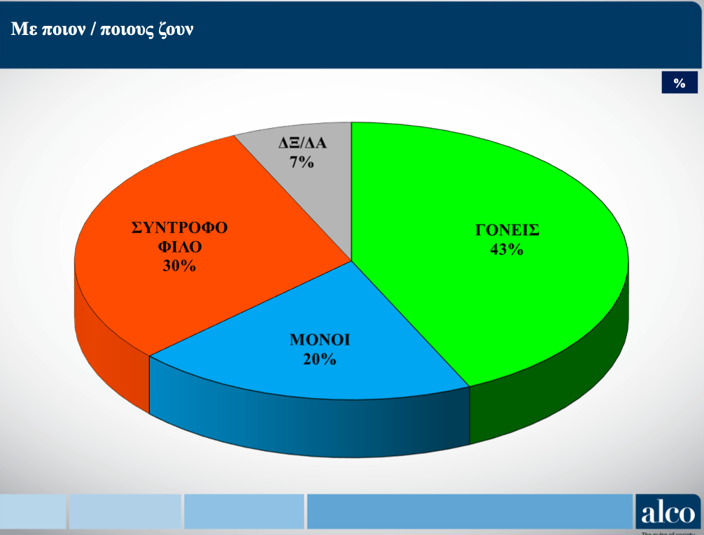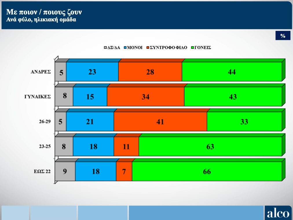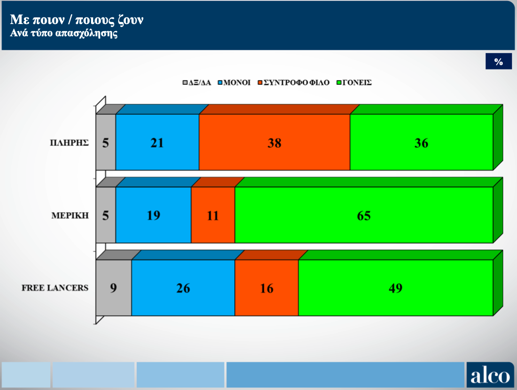 Παρά το γεγονός ότι εργάζονται, μόλις 20% των νέων ζουν μόνοι τους, ενώ 45% εξακολουθούν να μένουν με την οικογένειά τους (το ποσοστό αυτό γι αυτούς που εργάζονται με μερική απασχόληση ανεβαίνει στο 65%) και το 30% με φίλο ή σύντροφο. Μόλις το 30% συμβάλλει οικονομικά στο ενοίκιο ή στα έξοδα στέγασης.
