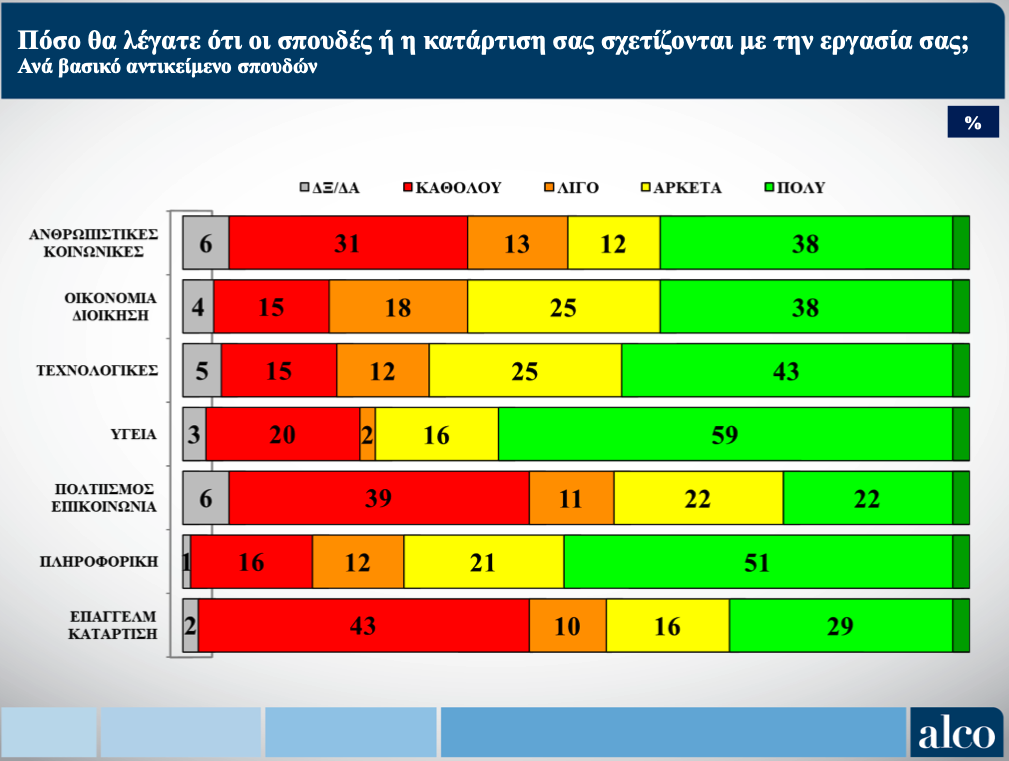 Η έρευνα αποκαλύπτει βαθύ χάσμα μεταξύ σπουδών και επαγγελματικής απασχόλησης. Το 38% δηλώνει ότι η εργασία του δεν σχετίζεται με το αντικείμενο σπουδών του, ενώ σχεδόν οι μισοί (49%) θεωρούν ότι η εκπαίδευσή τους δεν τους προετοίμασε επαρκώς για την αγορά εργασίας.