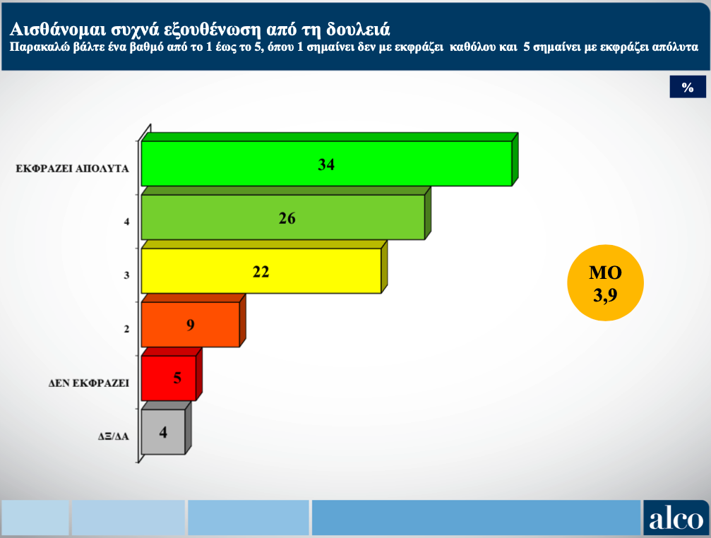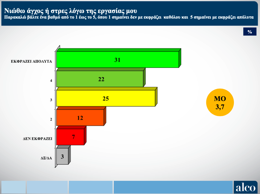 Η θετική ισορροπία ζωής–εργασίας καταγράφεται ιδιαίτερα χαμηλά στο 21%. Η συνολική ικανοποίηση από την εργασία κυμαίνεται στο 35%, ενώ άγχος – στρες δηλώνει ότι αντιμετωπίζει το 53%.