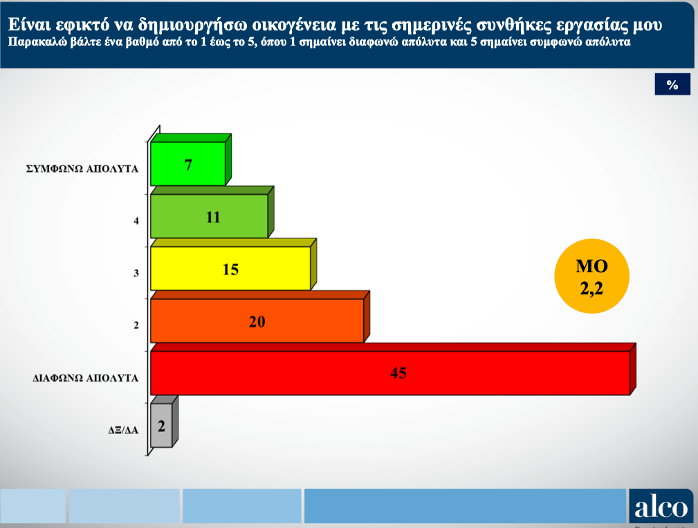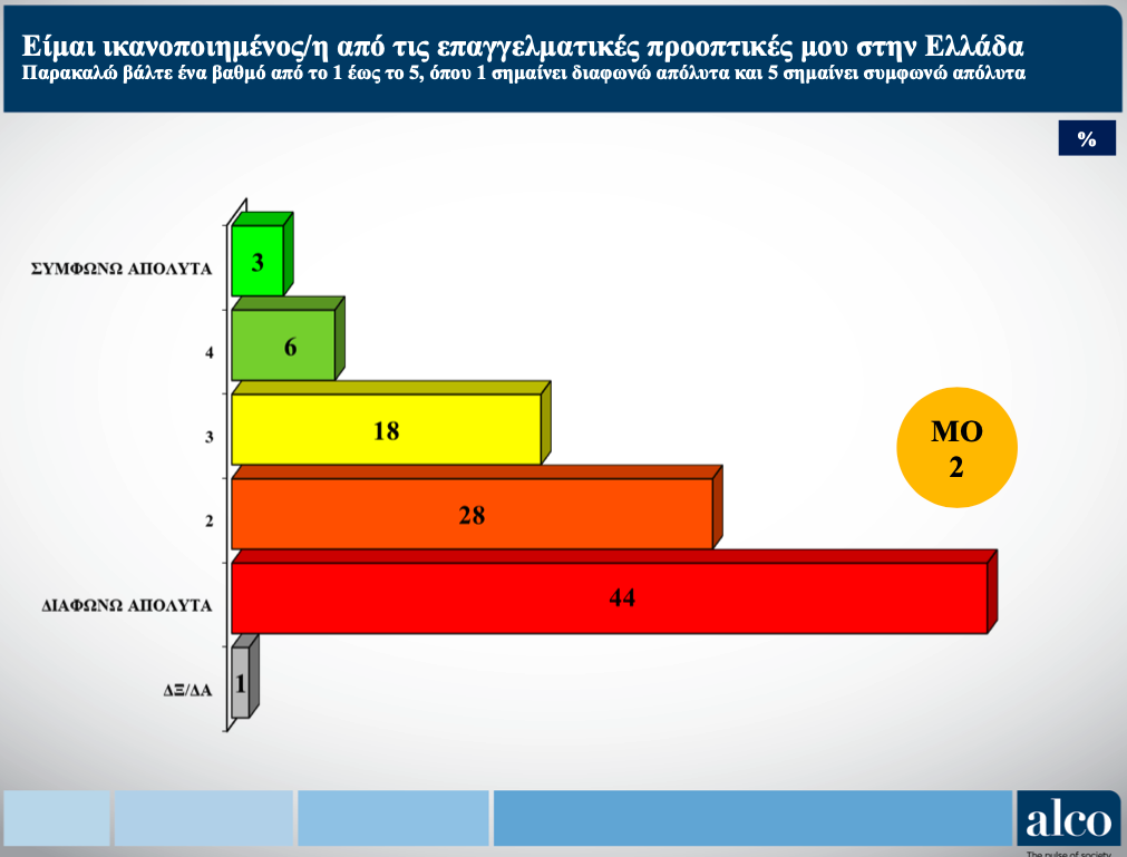 Το 72% των νέων εργαζομένων δηλώνει ότι δεν διαβλέπει προοπτικές στη χώρα, ενώ μόλις 9% δηλώνει ικανοποιημένο από τις επαγγελματικές του ευκαιρίες. Σχεδόν οι μισοί (46%) σκέφτονται να εργαστούν στο εξωτερικό. Το 79% πιστεύει ότι η γενιά των γονιών του έζησε καλύτερες συνθήκες, και 65% θεωρεί ανέφικτο να δημιουργήσει οικογένεια με τις σημερινές εργασιακές συνθήκες.