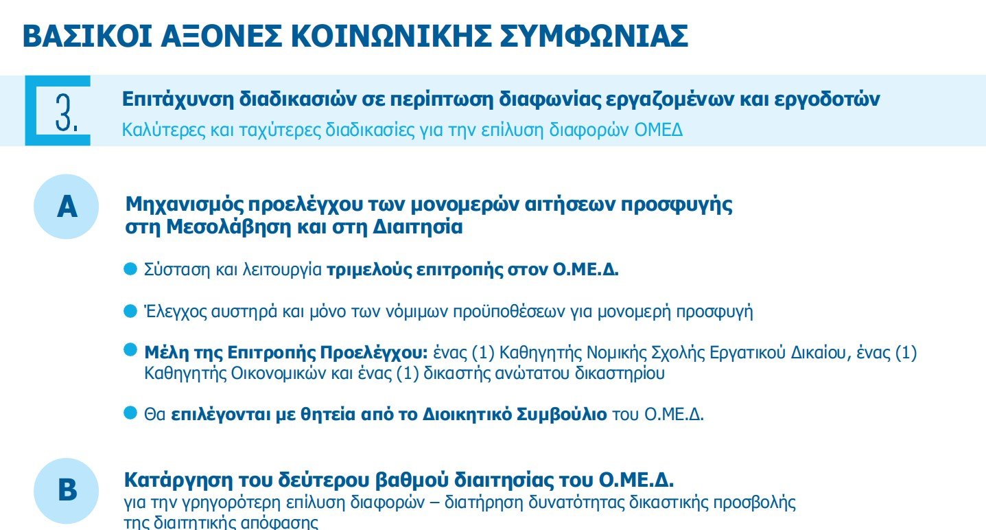 - Ενα ταχύ μηχανισμό ελέγχου του παραδεκτού των μονομερών αιτήσεων προσφυγής στον ΟΜΕΔ, με τη σύσταση και λειτουργία Επιτροπής στον ΟΜΕΔ, ο οποίος θα προχωρά σε προέλεγχο ότι συντρέχουν οι νόμιμες προϋποθέσεις. Η Επιτροπή απαρτίζεται από έναν καθηγητή Νομικής Σχολής Εργατικού Δικαίου και έναν Δικαστή ανώτατου Δικαστηρίου, οι οποίοι θα επιλέγονται με θητεία από το Δ.Σ. του ΟΜΕΔ.