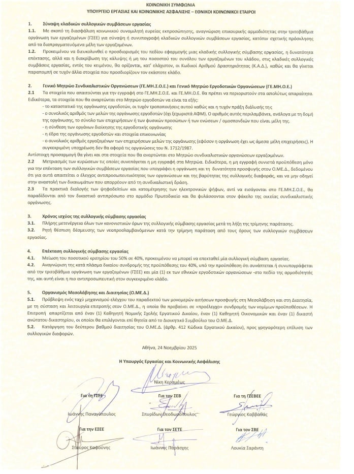Τα μέτρα για τη διευκόλυνση στη σύναψη κλαδικών συλλογικών συμβάσεων εργασίας (ΣΣΕ), από τη μείωση του ποσοστού συμμετοχής των επιχειρήσεων στο 40% από 50% για τη διευκόλυνση της επέκτασης των συλλογικών συμβάσεων έως την πλήρη μετενέργεια των συμβάσεων μετά τη λήξη τους και μέχρι την υπογραφή νέας καθώς και την ταχύτερη προσφυγή στον Οργανισμό Μεσολάβησης και Διαιτησίας (ΟΜΕΔ) προβλέπει η συμφωνία μεταξύ της Υπουργού Εργασίας και Κοινωνικής Ασφάλισης, Νίκης Κεραμέως, και των Εθνικών Κοινωνικών Εταίρων (ΓΣΕΕ, ΣΕΒ, ΓΣΕΒΕΕ, ΕΣΕΕ, ΣΕΤΕ και ΣΒΕ).