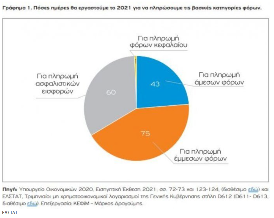 Ο μέσος Έλληνας χρειάστηκε το τρέχον έτος να δουλέψει 75 ημέρες για την πληρωμή έμμεσων φόρων, 60 ημέρες για την πληρωμή ασφαλιστικών εισφορών, 43 ημέρες για την πληρωμή άμεσων φόρων και 1 ημέρα για την πληρωμή των φόρων κεφαλαίου.