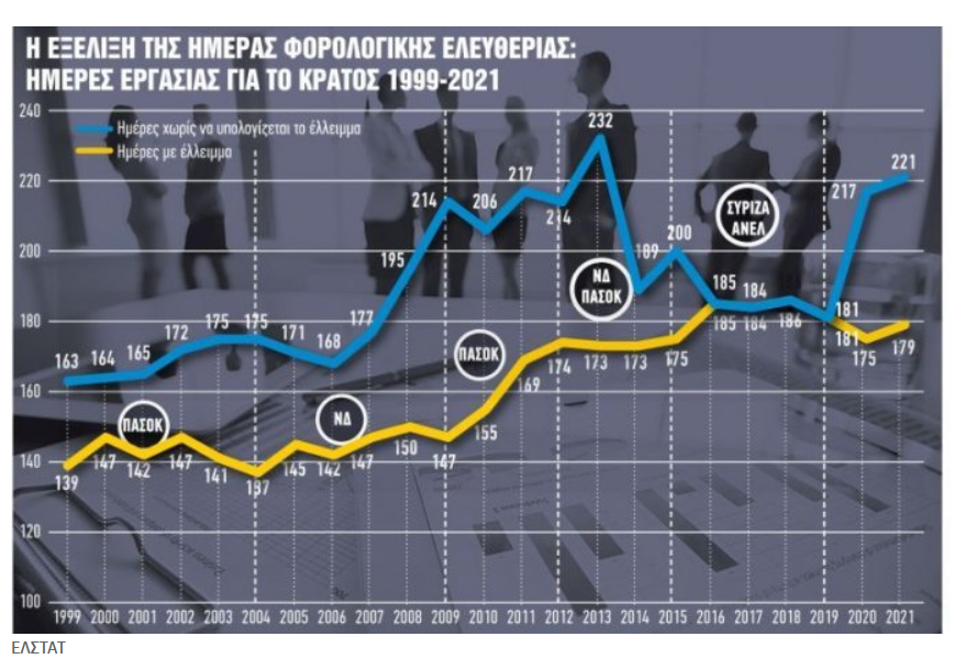 - Την εικοσαετία από το 1999 έως το 2018 προστέθηκαν 47 παραπάνω ημέρες εργασίας για το κράτος. Συγκεκριμένα το 1999 εργαστήκαμε 139 ημέρες, το 2012 174 ημέρες, ενώ το 2018 φτάσαμε τις 186 ημέρες εργασίας για να πληρωθούν οι φόροι και οι εισφορές.