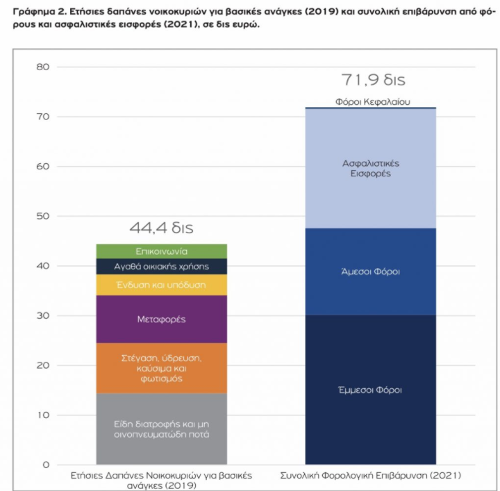 - Η συνολική επιβάρυνση πολιτών και επιχειρήσεων από φόρους και ασφαλιστικές εισφορές το 2019 ανέρχεται σε 71,9 δισ. και είναι σχεδόν διπλάσια από το ποσό που καταβάλλουν τα νοικοκυριά για την κάλυψη των βασικών τους αναγκών (ενδεικτικά: 44,4 δισ. το 2019 για διατροφή, ένδυση, στέγαση, οικιακά αγαθά, μεταφορές και επικοινωνίες, σύμφωνα με την προ πρόσφατη έρευνα της ΕΛΣΤΑΤ).