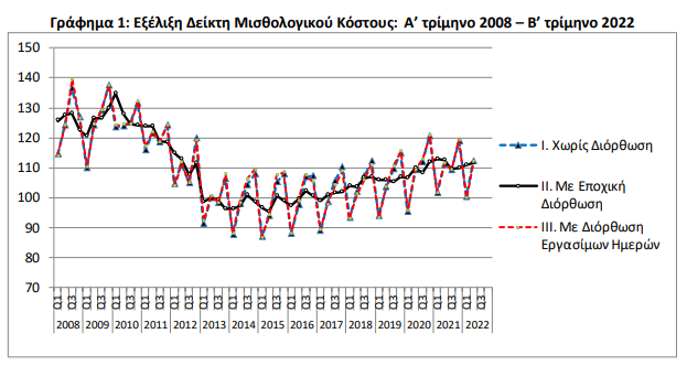 Σύμφωνα επίσης με την ΕΛΣΤΑΤ, ο δείκτης μισθολογικού κόστους, με εποχική διόρθωση αλλά χωρίς διόρθωση ως προς τον αριθμό των εργασίμων ημερών, παρουσίασε μείωση 0,9% σε σύγκριση με τον αντίστοιχο δείκτη του β' τριμήνου 2021, έναντι αύξησης 2,5% κατά την αντίστοιχη σύγκριση το 2021 προς το 2020.