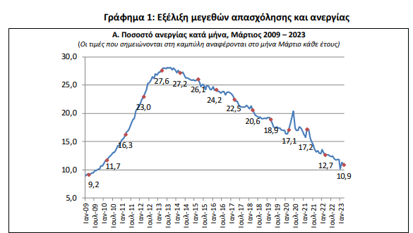 Το εποχικά διορθωμένο ποσοστό ανεργίας στην Ελλάδα τον Μάρτιο του 2023 ανήλθε σε 10,9% έναντι 12,7% τον Μάρτιο του 2022 και του αναθεωρημένου προς τα κάτω 11,3% τον Φεβρουάριο του 2023.