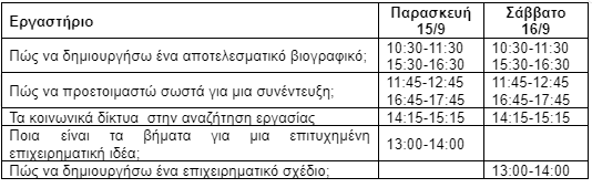 Μπορείτε να δείτε το πρόγραμμα της Παρασκευής στη διεύθυνση: https://www.dypa.gov.gr/storage/a1/workshops-150923-thessaloniki-1.jpg