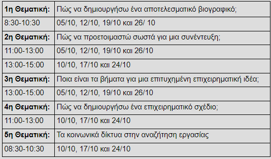 Ολοι όσοι αναζητούν εργασία και επιθυμούν να αναβαθμίσουν τις δεξιότητες τους στη διαχείριση της σταδιοδρομίας τους, μπορούν να παρακολουθήσουν e- Εργαστήρια στις εξής θεματικές ενότητες: