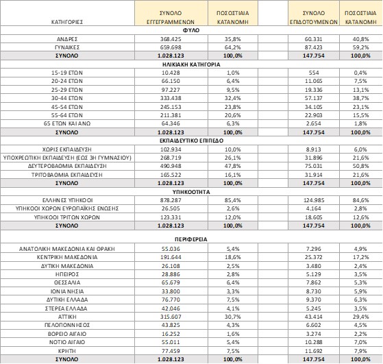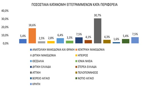 Μεταξύ των Περιφερειών της Χώρας η Περιφέρεια Αττικής και η Περιφέρεια Κεντρικής Μακεδονίας καταγράφουν τον μεγαλύτερο αριθμό εγγεγραμμένων ο οποίος ανέρχεται σε 315.607 άτομα (ποσοστό 30,7%) και 191.644 άτομα (ποσοστό 18,6%) αντίστοιχα.