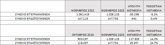 Το σύνολο των εγγεγραμμένων ανέργων στο μητρώο της Δ.ΥΠ.Α. για τον μήνα Νοέμβριο 2023, ανήλθε σε 1.028.123 άτομα. Από αυτά 500.602 (ποσοστό 48,7%) άτομα είναι εγγεγραμμένα στο μητρώο της Δ.ΥΠ.Α για χρονικό διάστημα ίσο ή και περισσότερο των 12 μηνών και 527.521 (ποσοστό 51,3%) είναι εγγεγραμμένα στο μητρώο της Δ.ΥΠ.Α. για χρονικό διάστημα μικρότερο των 12 μηνών.