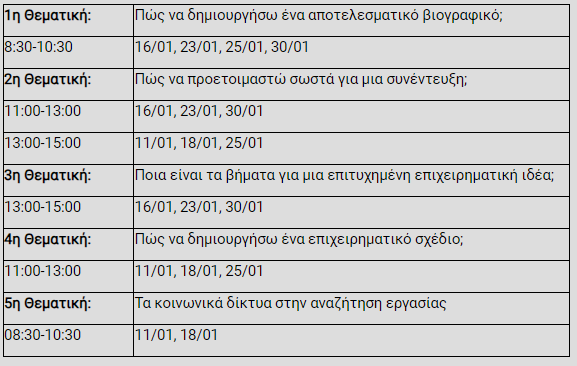 Όλοι όσοι αναζητούν εργασία και επιθυμούν να αναβαθμίσουν τις δεξιότητές τους στη διαχείριση της σταδιοδρομίας τους, μπορούν να παρακολουθήσουν e- εργαστήρια στις εξής θεματικές ενότητες: