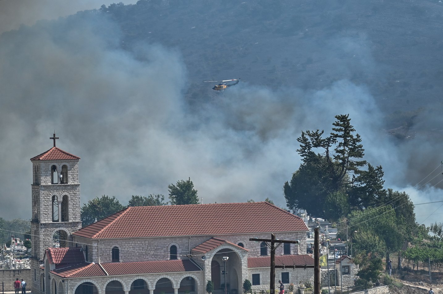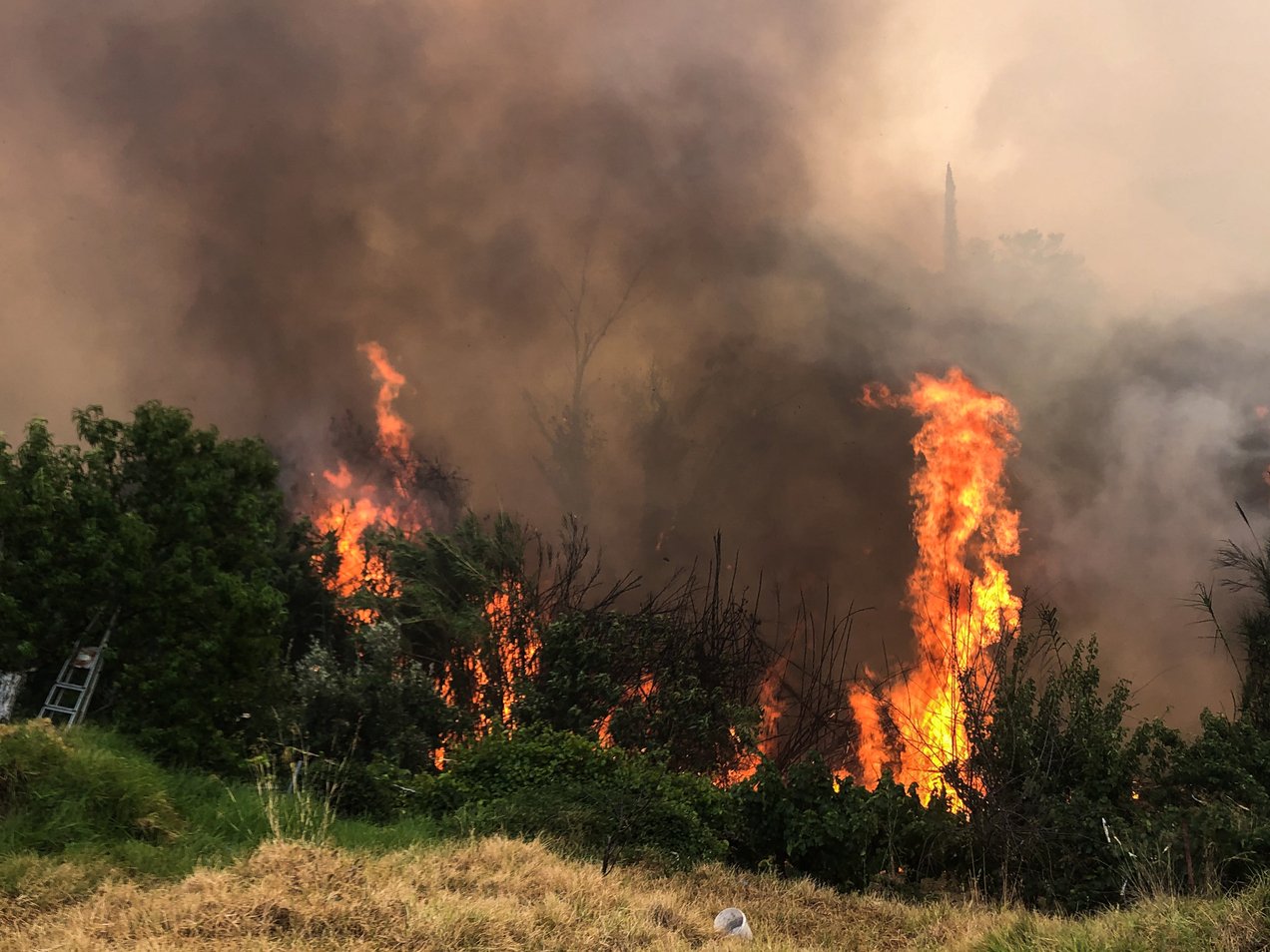 Εθελοντές και κάτοικοι της περιοχής συνδράμουν στο έργο της πυρόσβεσης και πολλά σπίτια σώθηκαν από τις φλόγες την τελευταία στιγμή.