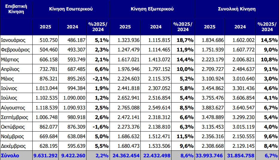 Η επιβατική κίνηση του αεροδρομίου της Αθήνας κατά τη διάρκεια του Δεκεμβρίου 2025 ανήλθε σε 2,31 εκατ., αυξημένη κατά 8,4% σε σύγκριση με τον Δεκέμβριο του 2024. Τόσο η εγχώρια, όσο και η διεθνής επιβατική κίνηση παρουσίασαν άνοδο, υπερβαίνοντας τα επίπεδα του 2024 κατά 5,5% και 9,6% αντίστοιχα. Συνολικά, σε ετήσια βάση, η κίνηση του αεροδρομίου έφθασε τους 34 εκατ. επιβάτες, σημειώνοντας άνοδο της τάξης του 6,7%. Η επιβατική κίνηση, τόσο του εσωτερικού, όσο και του εξωτερικού, παρουσίασε αύξηση της τάξης του 2,2% και 8,6% αντίστοιχα.