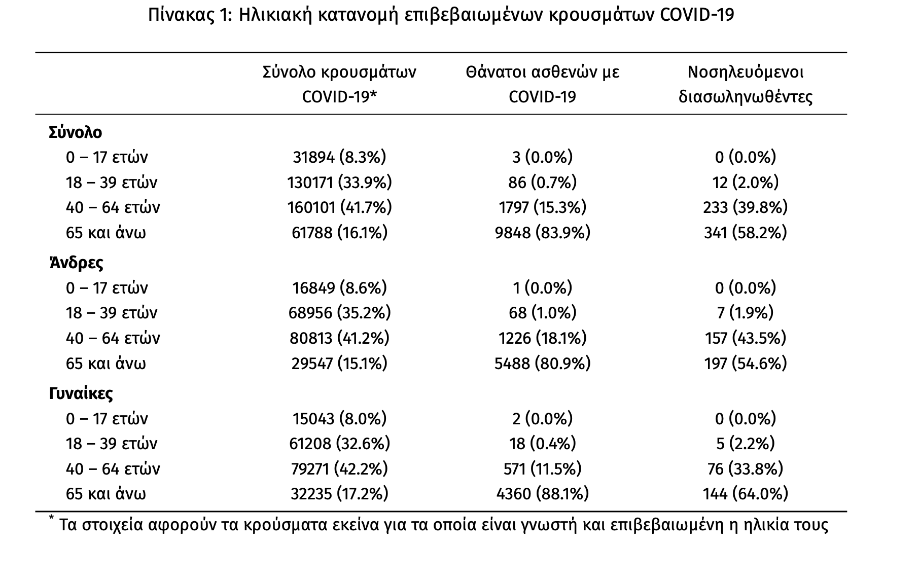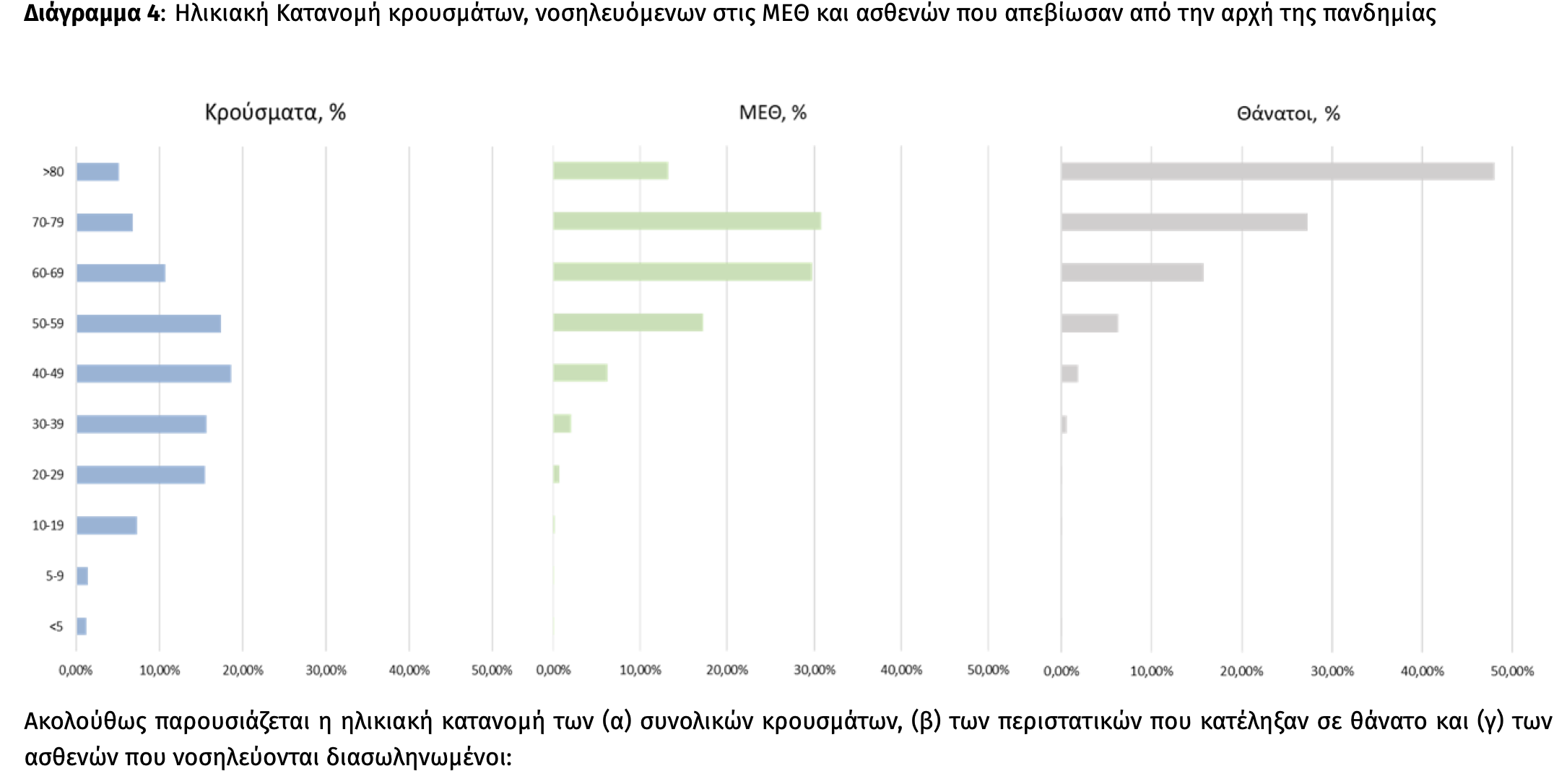 - Ο αριθμός των ασθενών που νοσηλεύονται διασωληνωμένοι είναι 586 (61.9% άνδρες). Η διάμεση ηλικία τους είναι 67 έτη. To 83.6% έχει υποκείμενο νόσημα ή/και ηλικία 70 ετών και άνω. Από την αρχή της πανδημίας έχουν εξέλθει από τις ΜΕΘ 2.342 ασθενείς.