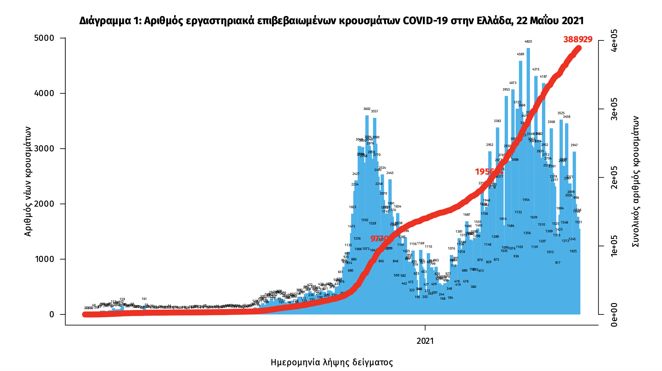 Ο ΕΟΔΥ ανακοίνωσε το Σάββατο 22 Μαΐου, 1.505 νέα κρούσματα κορονοϊού, 37 θανάτους και 586 διασωληνωμένους ασθενείς. Οι εισαγωγές νέων ασθενών Covid-19 στα νοσοκομεία της επικράτειας είναι 267 (ημερήσια μεταβολή +2.69%). Σημειώνεται ότι διενεργήθηκαν 55.141 τεστ (PCR:15.658, RAPID: 39.483) και η θετικότητα τους είναι στο 2,73%.