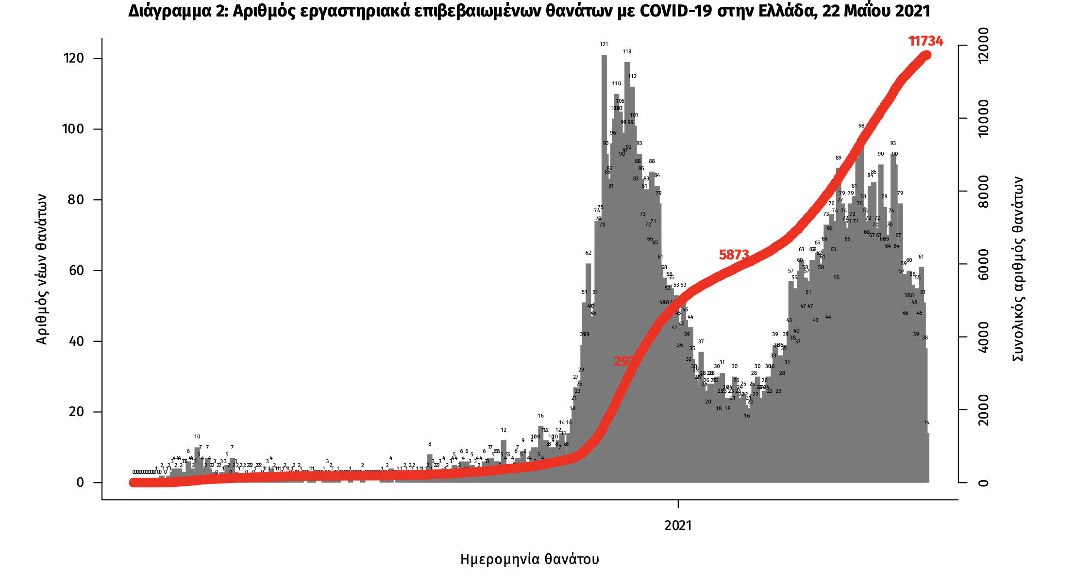 - Οι νέοι θάνατοι ασθενών με COVID-19 είναι 37, ενώ από την έναρξη της επιδημίας έχουν καταγραφεί συνολικά 11.734 θάνατοι. Το 95.2% είχε υποκείμενο νόσημα ή/και ηλικία 70 ετών και άνω.