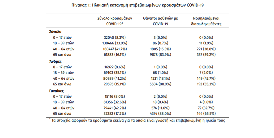 Οι νέοι θάνατοι ασθενών με COVID-19 είναι 38, ενώ από την έναρξη της επιδημίας έχουν καταγραφεί συνολικά 11.772 θάνατοι. Το 95.2% είχε υποκείμενο νόσημα ή/και ηλικία 70 ετών και άνω.