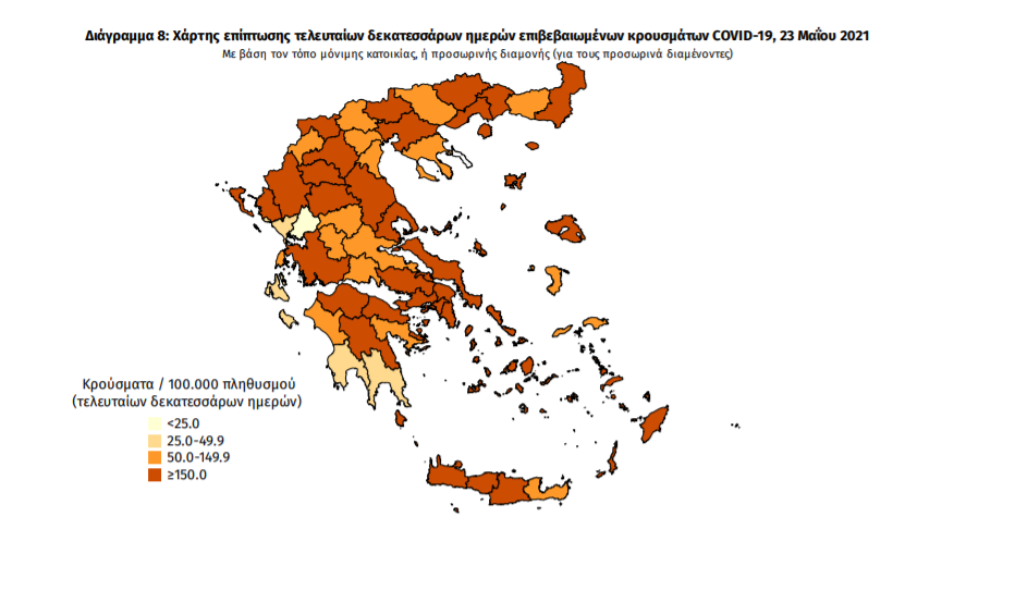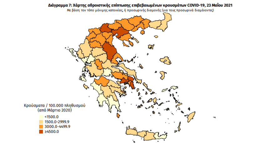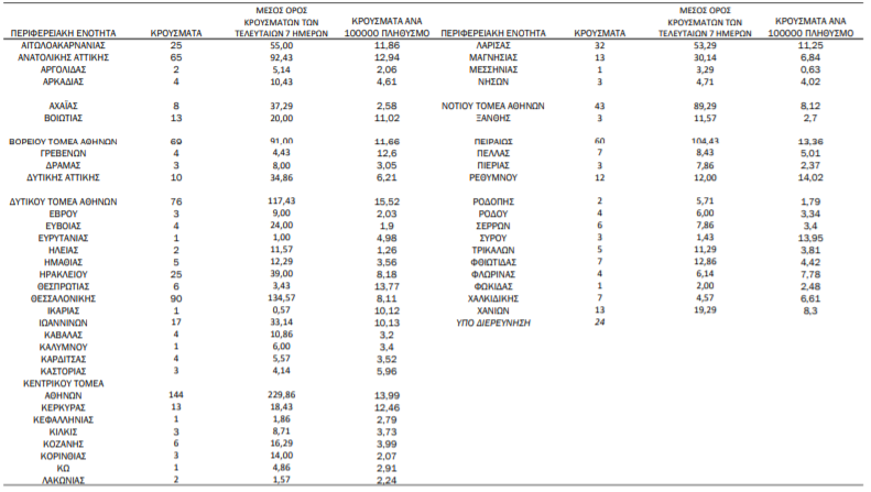 Με βάση τα επιβεβαιωμένα κρούσματα των τελευταίων 7 ημερών, 33 θεωρούνται σχετιζόμενα με ταξίδι από το εξωτερικό και 2.319 είναι σχετιζόμενα με ήδη γνωστό κρούσμα