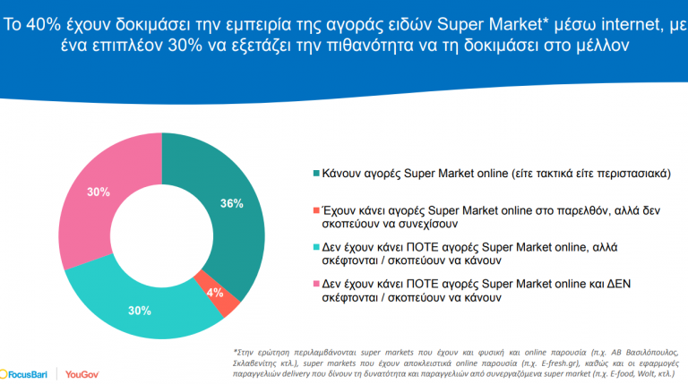 - 4 στους 10 Έλληνες ψώνισαν τουλάχιστον μια φορά είδη σούπερ μάρκετ online, επιπλέον 1 στους 3 σκέπτονται να υιοθετήσουν αυτή την συνήθεια στο μέλλον.