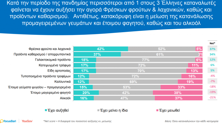 - Κατά την περίοδο της πανδημίας, περισσότεροι από 1 στους 3 Έλληνες καταναλωτές φαίνεται να έχουν αυξήσει την αγορά φρέσκων φρούτων & λαχανικών, και προϊόντων καθαρισμού.