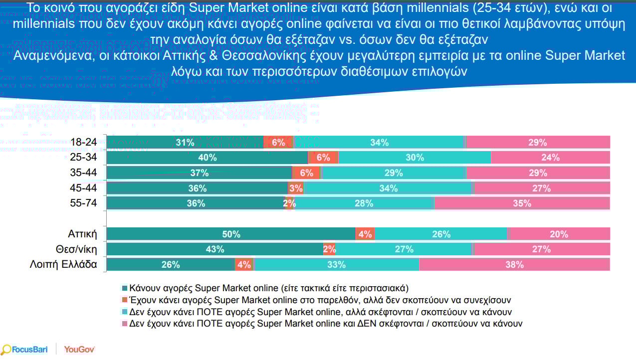 Όσον αφορά το κοινό που αγοράζει είδη super market online, είναι κατά βάση millennials (25-34 ετών), ενώ και οι millennials που δεν έχουν ακόμη κάνει αγορές online φαίνεται να είναι οι πιο θετικοί, λαμβάνοντας υπόψη την αναλογία όσων θα εξέταζαν κάτι τέτοιο, έναντι όσων δεν θα το εξέταζαν.