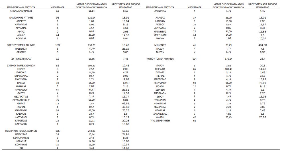 Ο πίνακας των κρουσμάτων ανά περιφερειακή ενότητα
