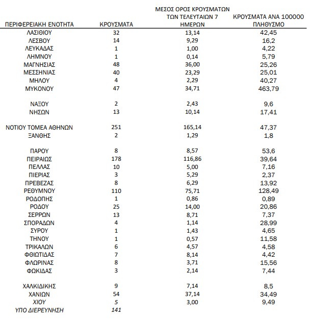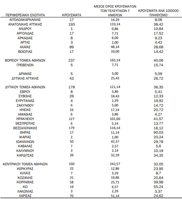 Αναλυτικά η κατανομή των κρουσμάτων σήμερα Τετάρτη 14 Ιουλίου στη χώρα μας: