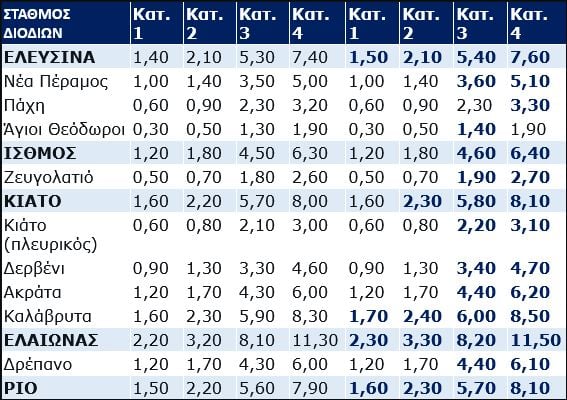 Οι νέες τιμές ανά σταθμό και κατηγορία οχήματος έχουν ως εξής: