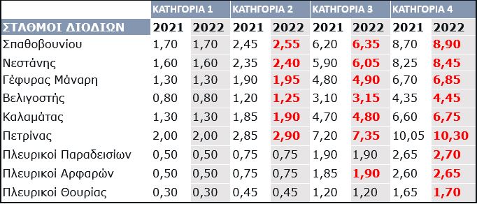 Με βάση τα προβλεπόμενα από τη Σύμβαση Παραχώρησης του Έργου «Μελέτη, Κατασκευή, Χρηματοδότηση, Λειτουργία, Συντήρηση και Εκμετάλλευση του αυτοκινητόδρομου Κόρινθος - Τρίπολη - Καλαμάτα και κλάδος Λεύκτρο - Σπάρτη» (νόμος 3559/2007, όπως τροποποιήθηκε και ισχύει), από τα μεσάνυχτα της Παρασκευής 31 Δεκεμβρίου 2021 προς Σάββατο 1 Ιανουαρίου 2022 (ώρα 00:00 της 1/1/2022), οι χρεώσεις στους σταθμούς διοδίων του αυτοκινητοδρόμου αναπροσαρμόζονται τιμαριθμικά για το έτος 2022.