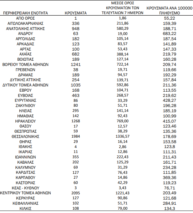 Επιπλέον, 37 περιοχές καταγράφουν τριψήφιο αριθμό κρουσμάτων.