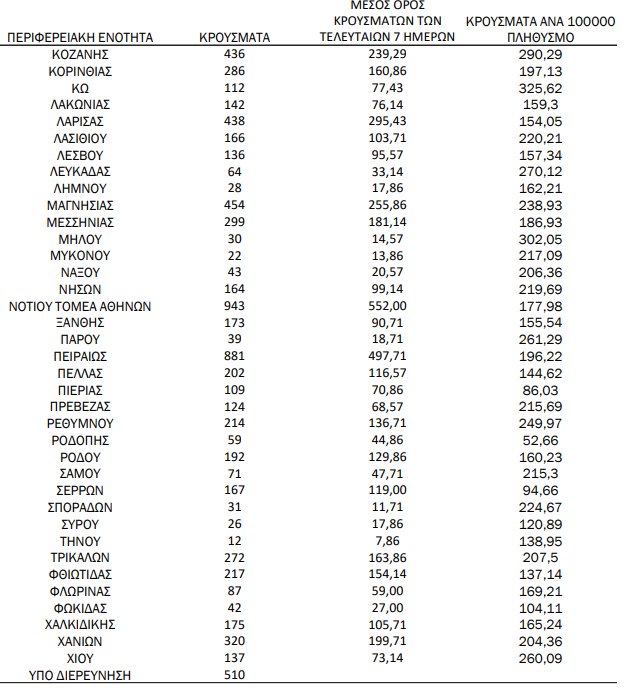 Τέλος, 510 κρούσματα βρίσκονται υπό διερεύνηση.