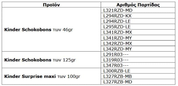 Ο ΕΦΕΤ ενημερώθηκε από το Σύστημα Έγκαιρης Προειδοποίησης για τα Τρόφιμα και τις Ζωοτροφές (RASFF), σχετικά με την προληπτική ανάκληση συγκεκριμένων παρτίδων των προϊόντων Kinder Schokobons των 46 gr & 125 gr και Kinder Surprise maxi των 100 gr, λόγω πιθανής παρουσίας σαλμονέλας.