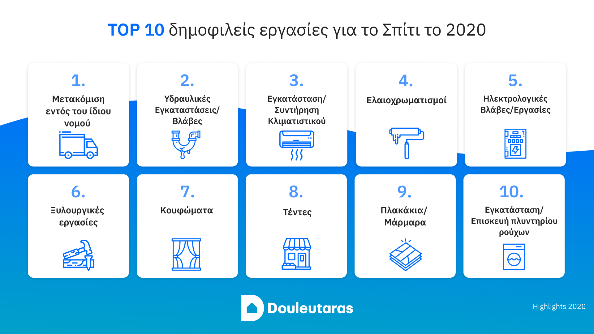 Σε ό,τι αφορά τις 10 δημοφιλέστερες εργασίες για το σπίτι το 2020, η μετακόμιση εντός του ίδιου νομού έρχεται πρώτη, ενώ ακολουθούν οι υδραυλικές εγκαταστάσεις/βλάβες, η εγκατάσταση/συντήρηση κλιματιστικού, οι ελαιοχρωματισμοί, οι ηλεκτρολογικές βλάβες/εργασίες, οι ξυλουργικές εργασίες, τα κουφώματα, οι τέντες, τα πλακάκια/μάρμαρα και η εγκατάσταση/επισκευή πλυντηρίου ρούχων.