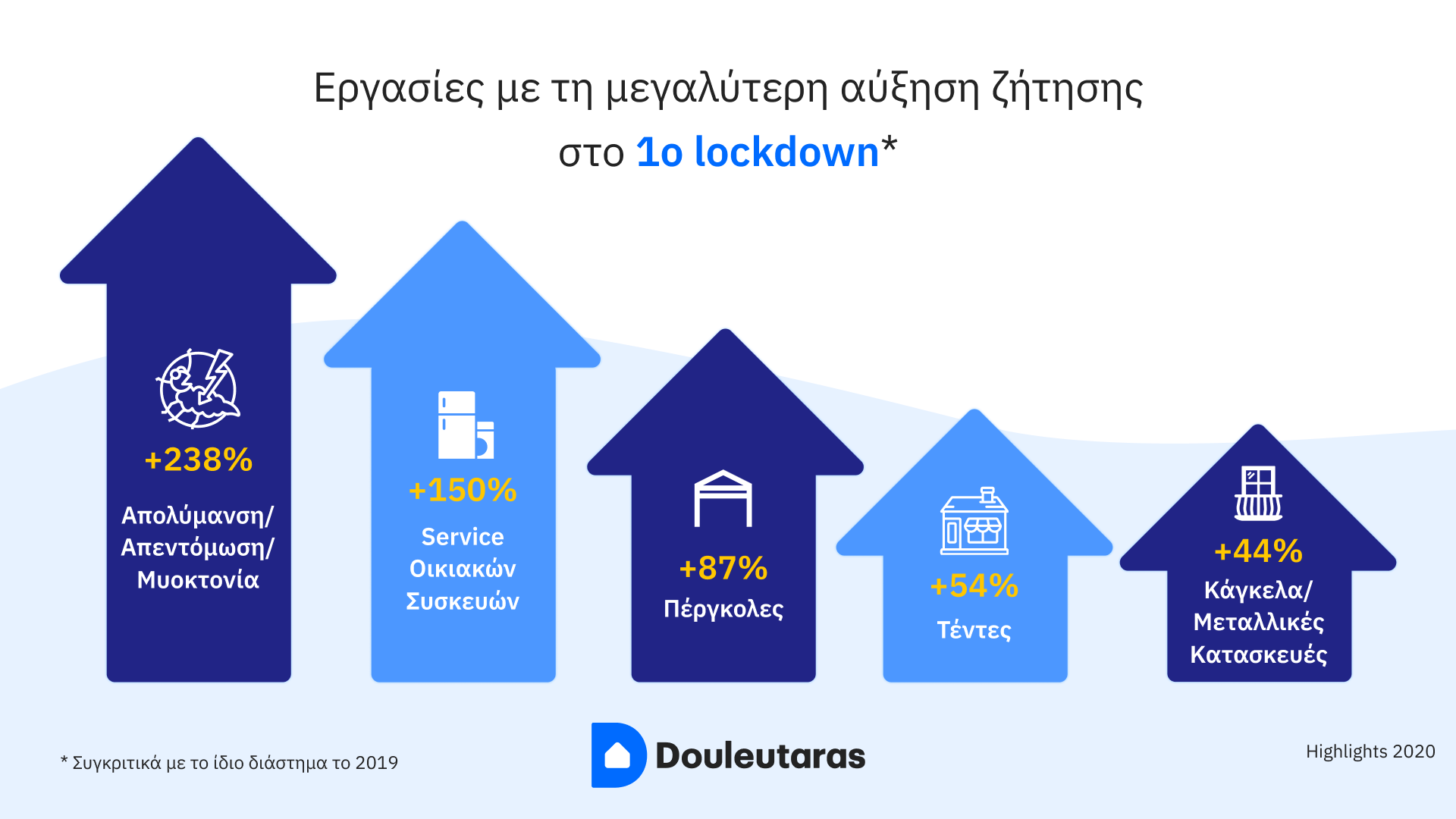 Στο πρώτο lockdown (Μάρτιο-Μάιο) δεν αποτελεί έκπληξη που οι εργασίες απολύμανσης σημείωσαν αύξηση ζήτησης της τάξης του 238% συγκριτικά με το ίδιο διάστημα το 2019, γεγονός που οφείλεται στη «θωράκιση» των κατοικιών και των επαγγελματικών χώρων κατά του Covid-19.