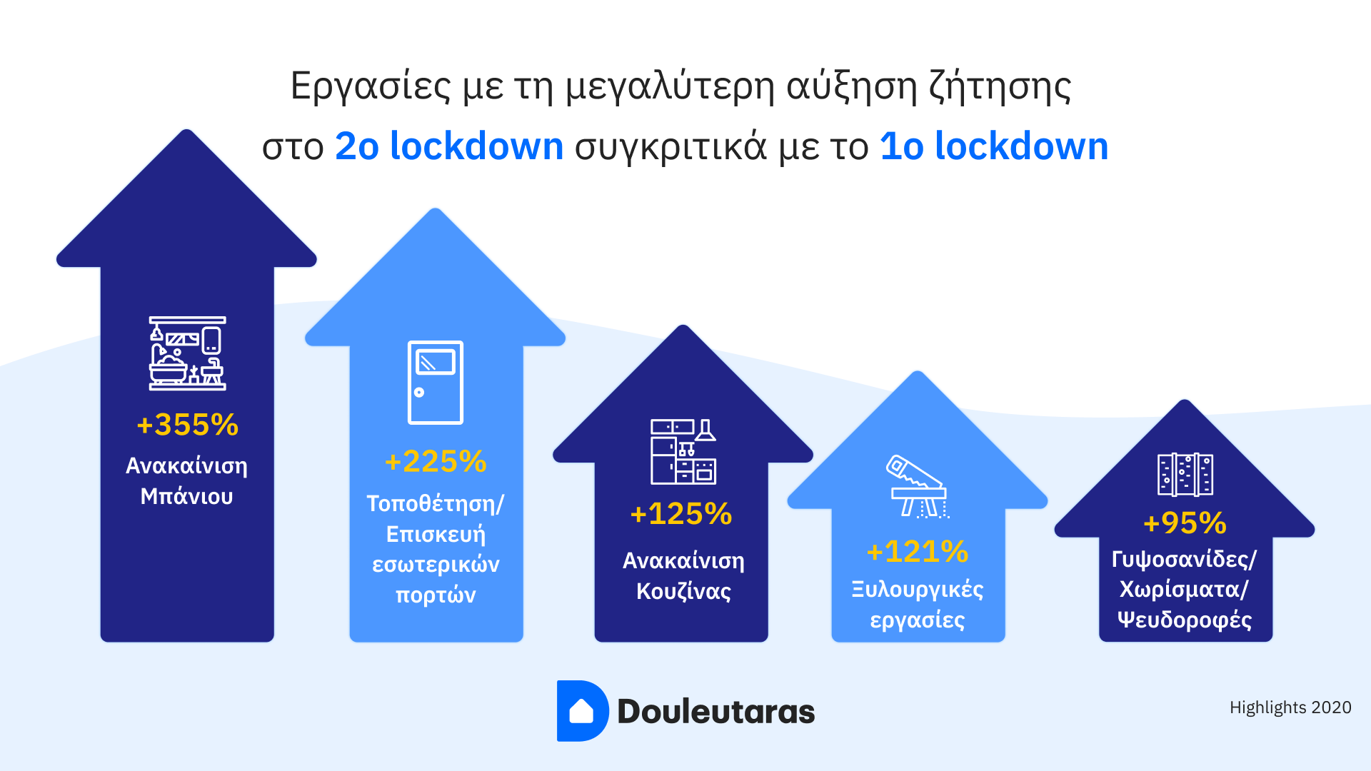 Η εργασία με τη μεγαλύτερη αύξηση σε ζήτηση σε σχέση με το 2019 ήταν η τοποθέτηση/επισκευή εσωτερικών πορτών, που παρουσίασε αύξηση 123%. Ακολουθούν οι ξυλουργικές εργασίες με άνοδο 108% και η εγκατάσταση/επισκευή απορροφητήρα με +96%. Στην 4η θέση βρίσκονται οι εργασίες που έχουν να κάνουν με τα τζάκια (+89%) και έπονται το service οικιακών συσκευών (+77%), οι εργασίες απολύμανσης/απεντόμωσης/μυοκτονίας (+74%), τα κάγκελα/μεταλλικές κατασκευές (+73%), η θέρμανση (+61%), η τοποθέτηση τζαμιών/υαλοπινάκων/πλέξιγκλας (+53%) και τέλος οι πέργκολες (+49%).