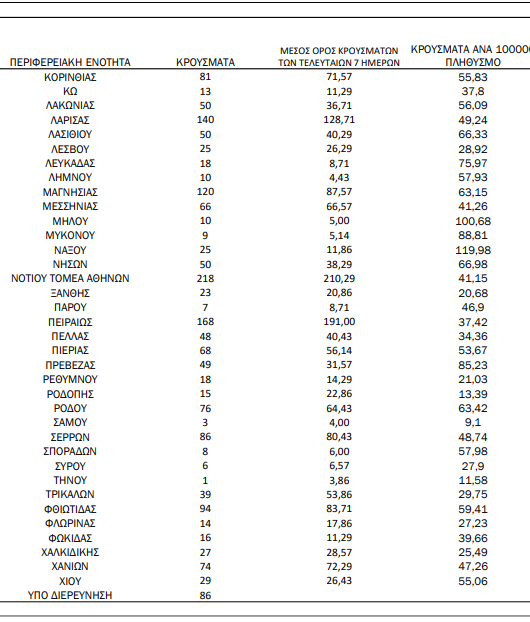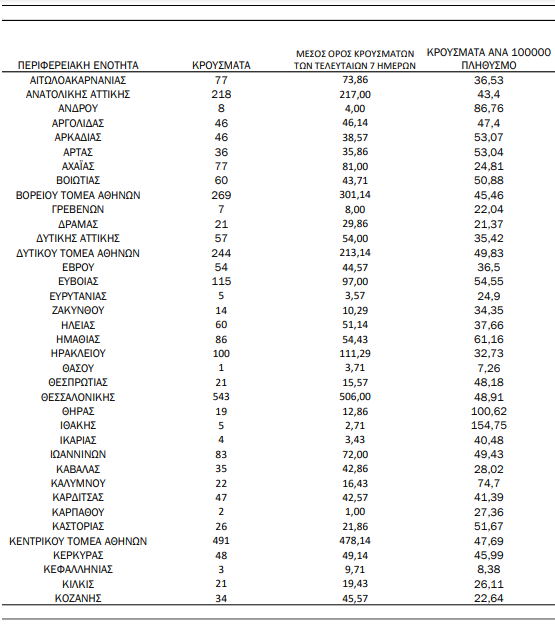 Ο ΕΟΔΥ ανακοίνωσε σήμερα ότι εντοπίστηκαν 4.727 νέα κρούσματα κοροναϊού το τελευταίο 24ωρο και ακόμα 41 θάνατοι. Από αυτά τα 1.715 κρούσματα καταγράφηκαν στην Αττική και 543 στη Θεσσαλονίκη.