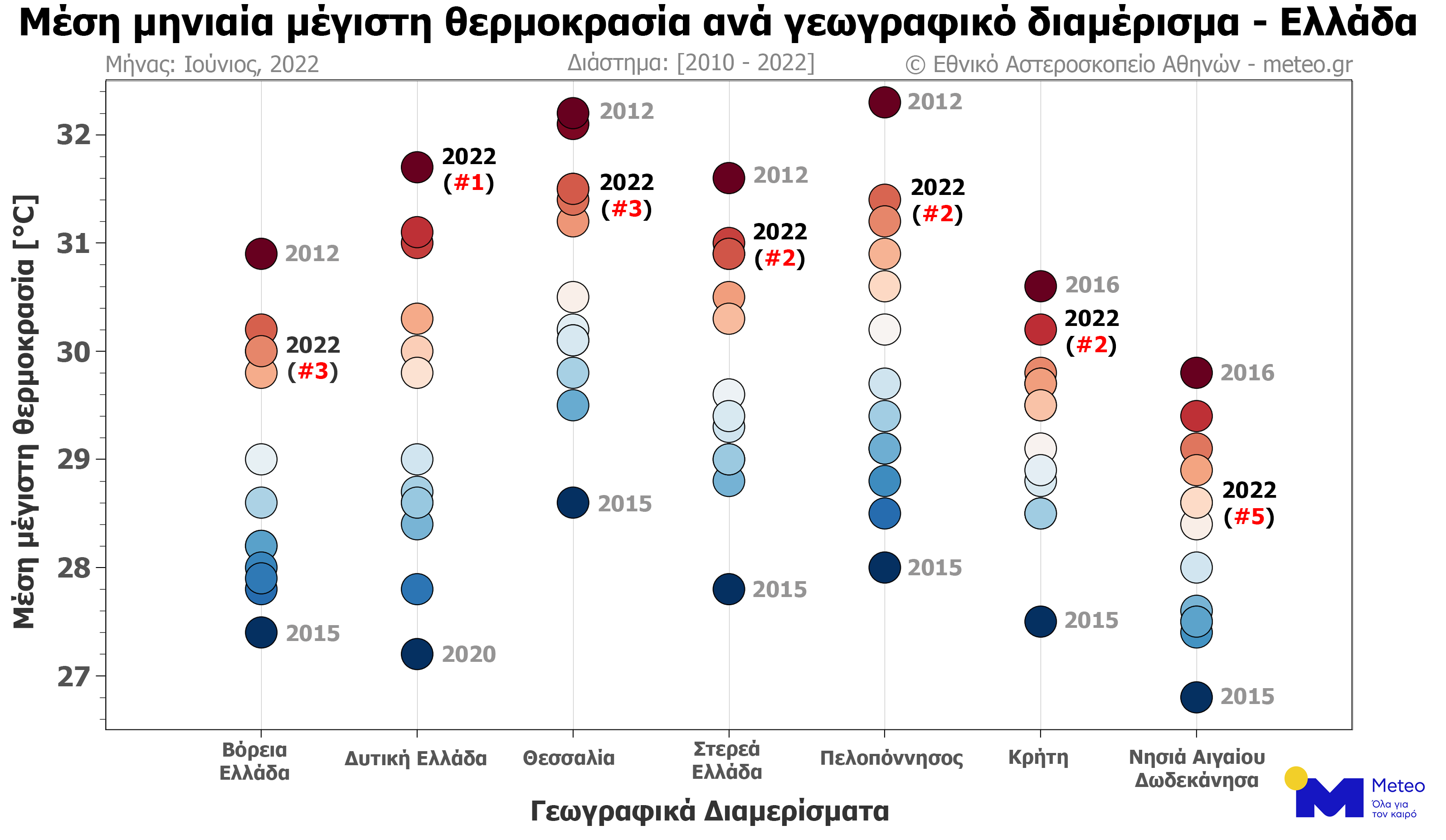 Υψηλές, για την εποχή, τιμές μεγίστων θερμοκρασιών κατέγραψαν 52 μετεωρολογικοί σταθμοί του Εθνικού Αστεροσκοπείου Αθηνών/meteo.gr κατά τον Ιούνιο του 2022. Σε όλα τα γεωγραφικά διαμερίσματα της χώρας καταγράφηκαν θετικές αποκλίσεις θερμοκρασίας, σε σύγκριση με τις μέσες τιμές της περιόδου 2010-2019.