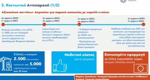 Η δράση στοχεύει την ανέγερση 2.500 κατοικιών, στις οποίες θα στεγαστούν 5.000 ωφελούμενοι. Η επιλογή των οικοπέδων θα ξεκινήσει εφέτος, ενώ ο διαγωνισμός για την επιλογή των αναδόχων προγραμματίζεται για τα μέσα του 2023. Θα ακολουθήσει η ανέγερση των κατοικιών, η πρόσκληση και η επιλογή των ωφελουμένων.